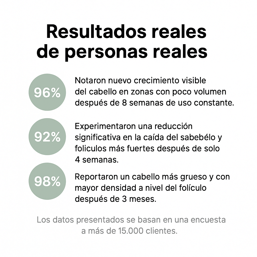 La mayoría comienza a notar nuevos cabellos en 2 a 4 semanas. Depende de la salud del cuero cabelludo y de la constancia, pero al usarlo diariamente estás impulsando un cambio real donde más importa.