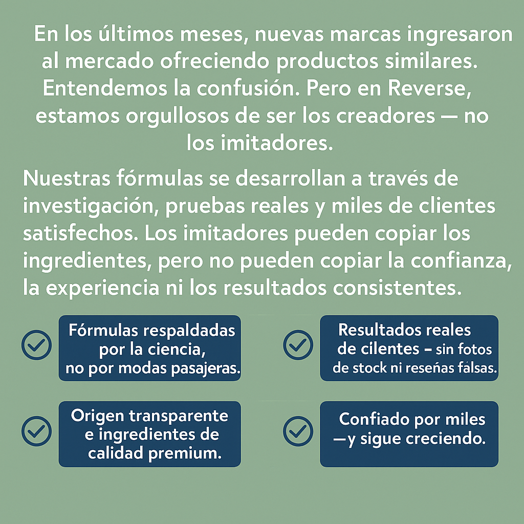 Si estás notando un adelgazamiento temprano —especialmente alrededor de la línea del cabello o las sienes— Reverse está hecho para vos. Miles de hombres ya recuperaron cabellos nuevos visibles con esta misma fórmula. No es magia, es ciencia respaldada por la constancia.